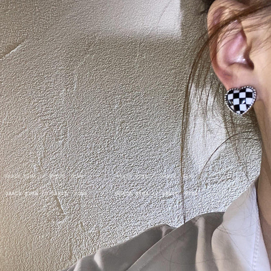 爱心棋盘格耳钉Chess Silver Plated Stud Earrings