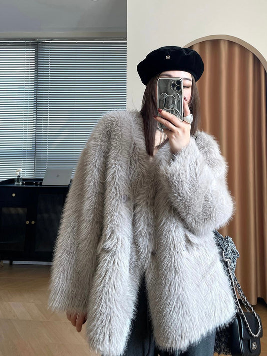 时髦精V领皮草Faux Fur Coat