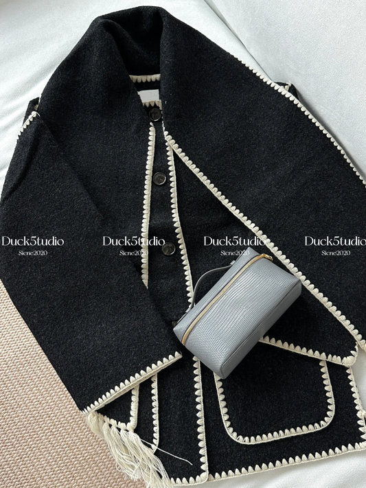 北欧撞色围巾大衣Black Embroidery Coat