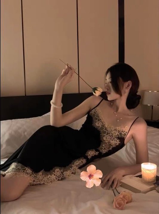 新中式盘扣蕾丝睡裙Strap Lace High Split Silk Dress