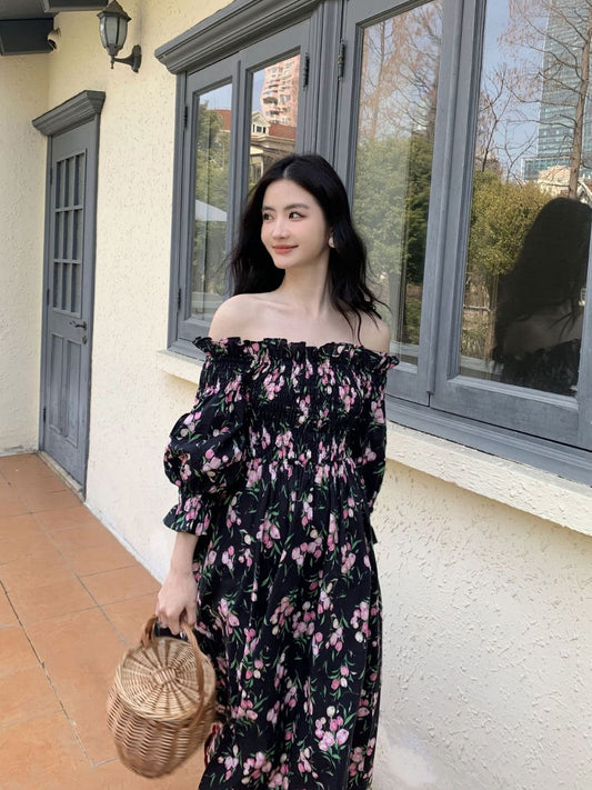 浪漫郁金香一字肩连衣裙Gentle Romance Floral Dress