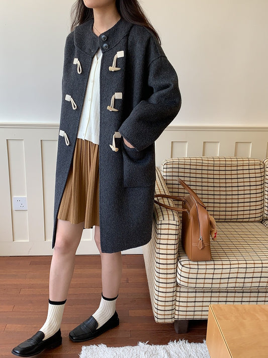 韩系学院风牛角扣蚕丝羊毛双面呢连帽大衣Korean button wool double-sided tweed coat
