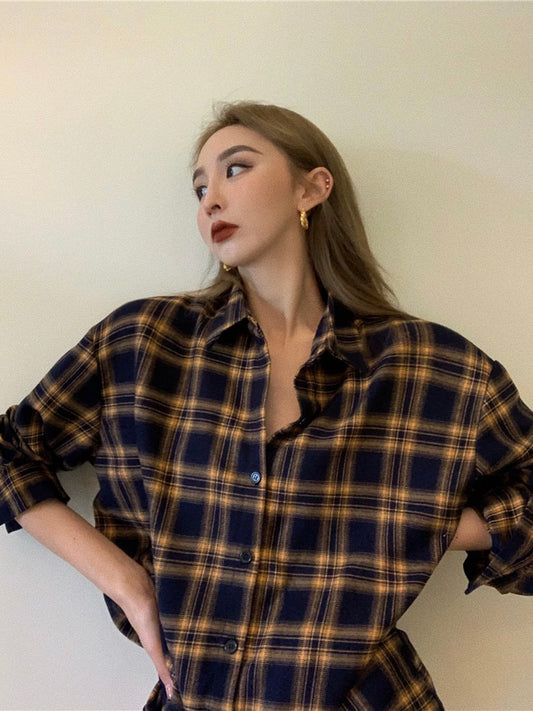松弛慵懒长袖复古格纹衬衫Loose Vintage Check Shirt