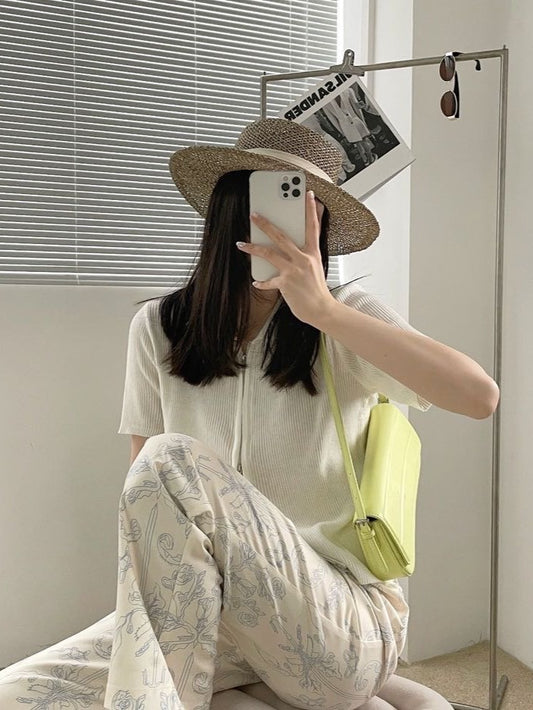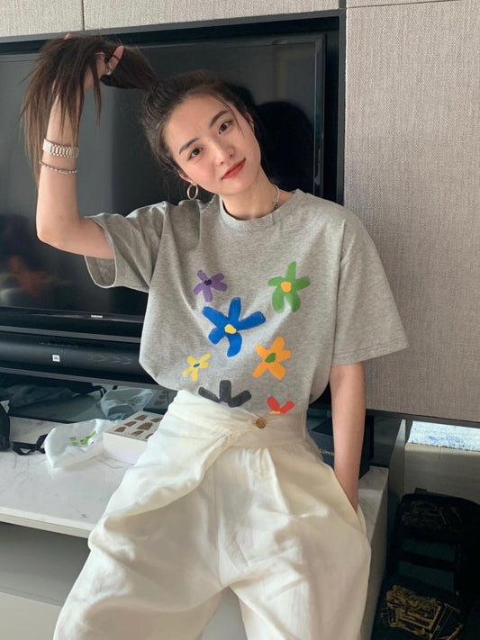 孤品半价清_灰色小花全棉短袖Grey Flower Pattern Drop Shoulder Top